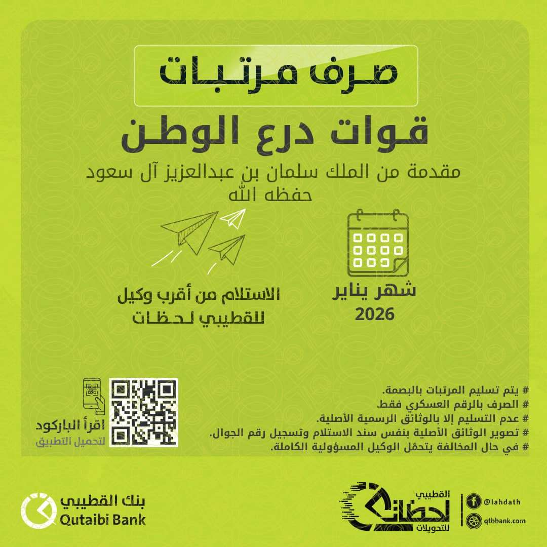 أعلن بنك القطيبي الإسلامي بدء صرف مرتبات مرتبات منتسبي قوات درع الوطن لشهر يناير 2026، والمقدمة بدعم من خادم الحرمين الشريفين الملك سلمان بن عبدالعزيز آل سعود حفظه الله.