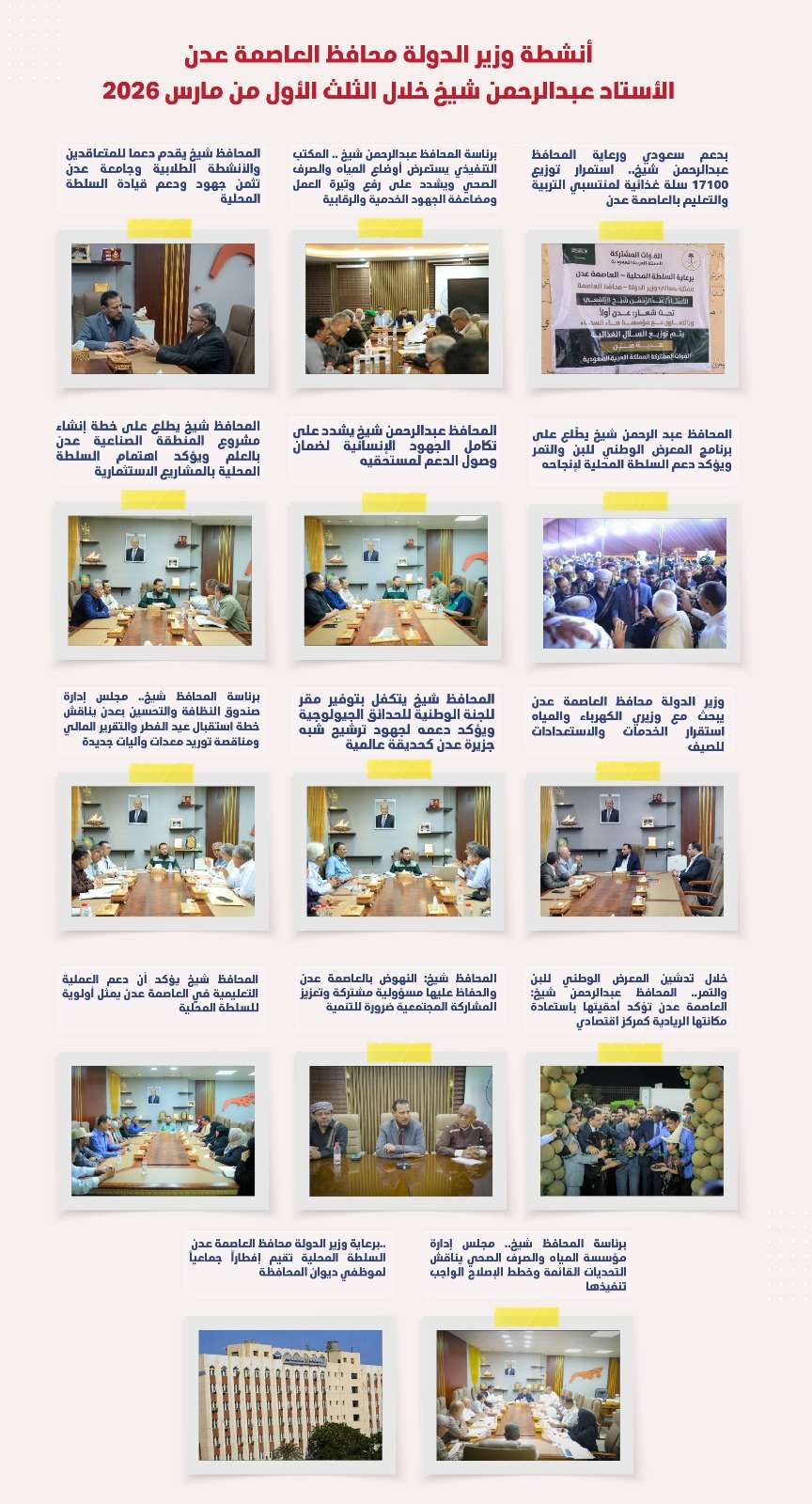 عملت السلطة المحلية بالعاصمة عدن خلال الثلث الأول من شهر مارس الجاري سلسلة من الأنشطة والتحركات مكتبيا وميدانيا بقيادة وزير الدولة محافظ العاصمة عدن عبدالرحمن شيخ، ركزت على مواجهة التحديات ومعالجة الاشكاليات وتحسين الخدمات الأساسية، ودعم القطاعات الحيوية، وتعزيز الشراكات التنموية والاستثمارية بما يسهم في تلبية احتياجات المواطنين ودفع عجلة التنمية في المدينة.