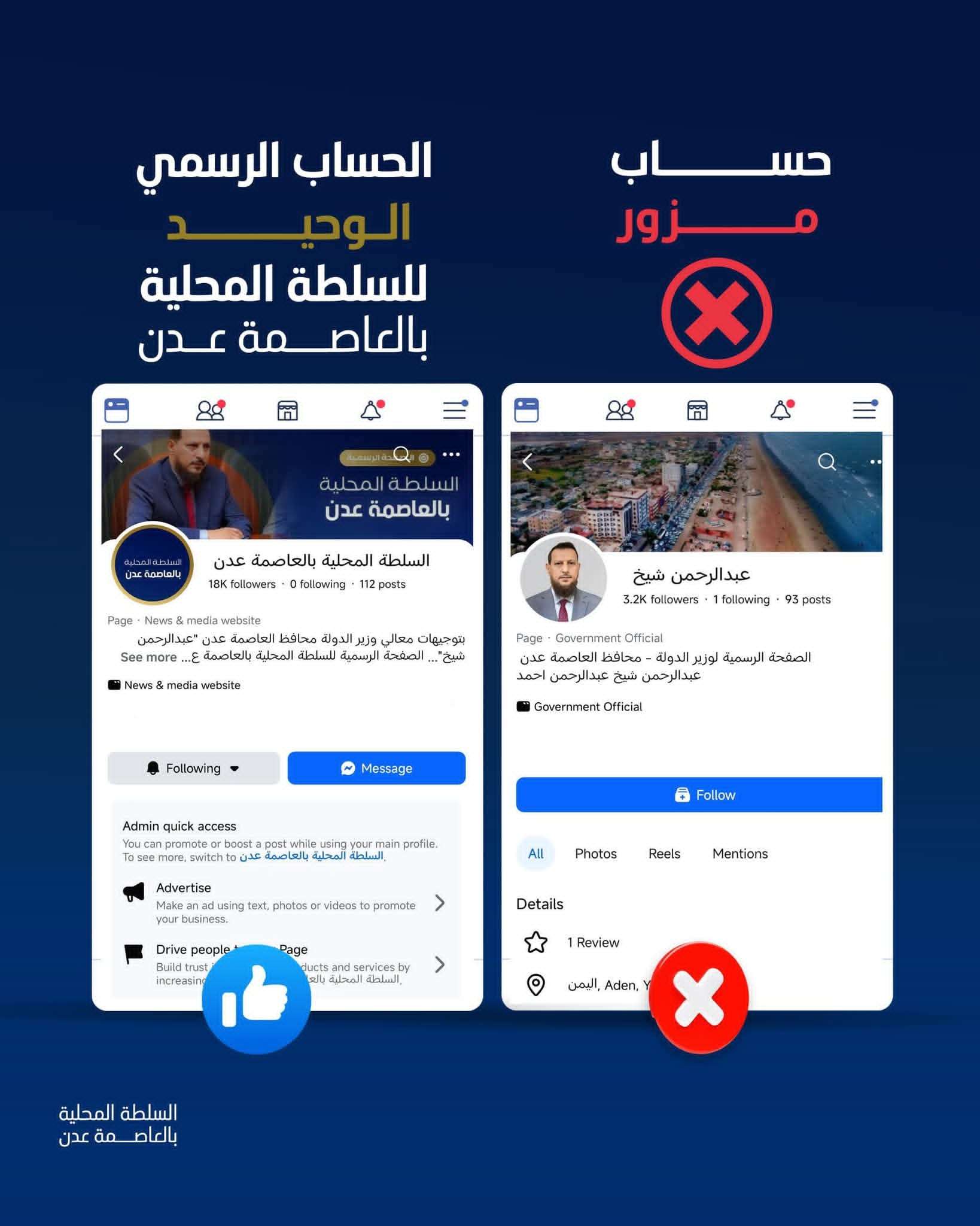 بناءً على التعميم الصادر عن وكيل العاصمة عدن لقطاع الإعلام، الأستاذ محمد سعيد سالم، في 8 يناير 2026م، نؤكد أن المصدر الرسمي والوحيد المعتمد لتمثيل السلطة المحلية على منصات التواصل الاجتماعي هو الحساب التالي على منصة فيسبوك: السلطة المحلية بالعاصمة عدن (@AdenGov).