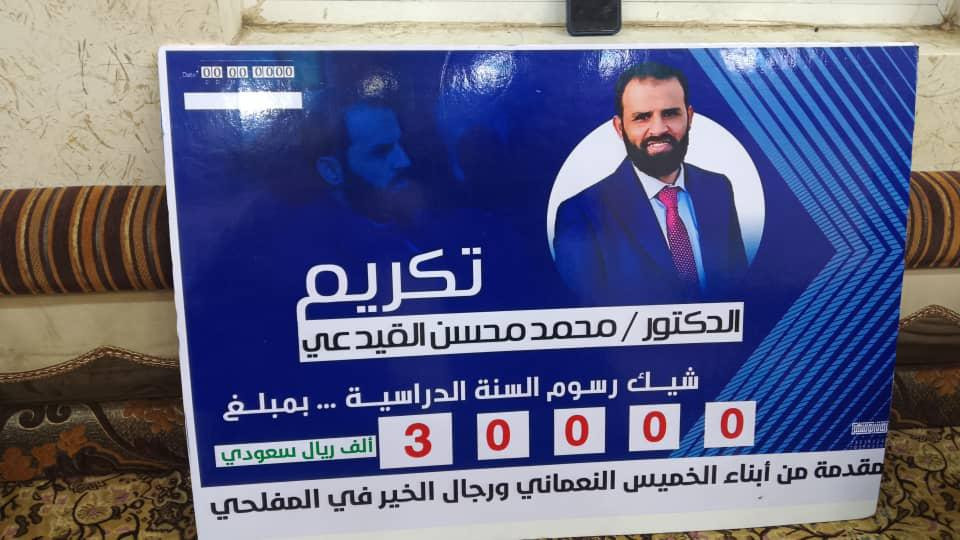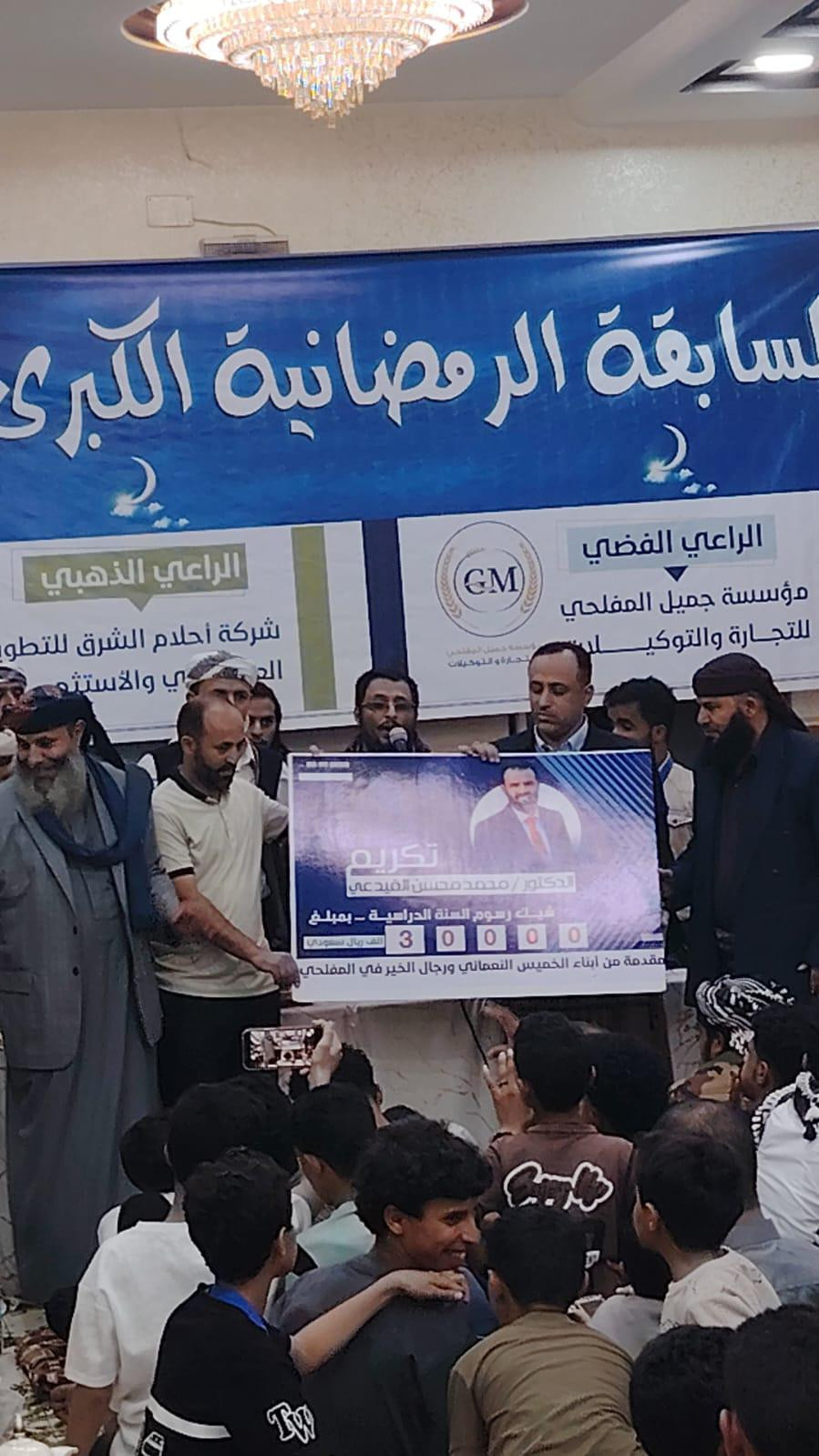 وكان أبرز فقرات التكريم، تكريم الدكتور محمد محسن القيدعي، أخصائي المخ والأعصاب في جمهورية مصر العربية، بمنحة مالية قدرها 30 ألف ريال سعودي، مقدمة من رجال الخير في المنطقة، وذلك دعماً له لتغطية رسوم عام دراسي كامل في مصر، في لفتة إنسانية كريمة تعكس روح التكافل والتشجيع على العلم.