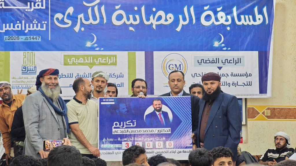 شهدت قرية تي الشرافس بمديرية المفلحي أمسية رمضانية احتفالية مميزة، وُصفت بأنها فريدة من نوعها، وذلك برعاية شركة أحلام الشرق للتطوير العقاري ومؤسسة جميل المفلحي للتجارة.