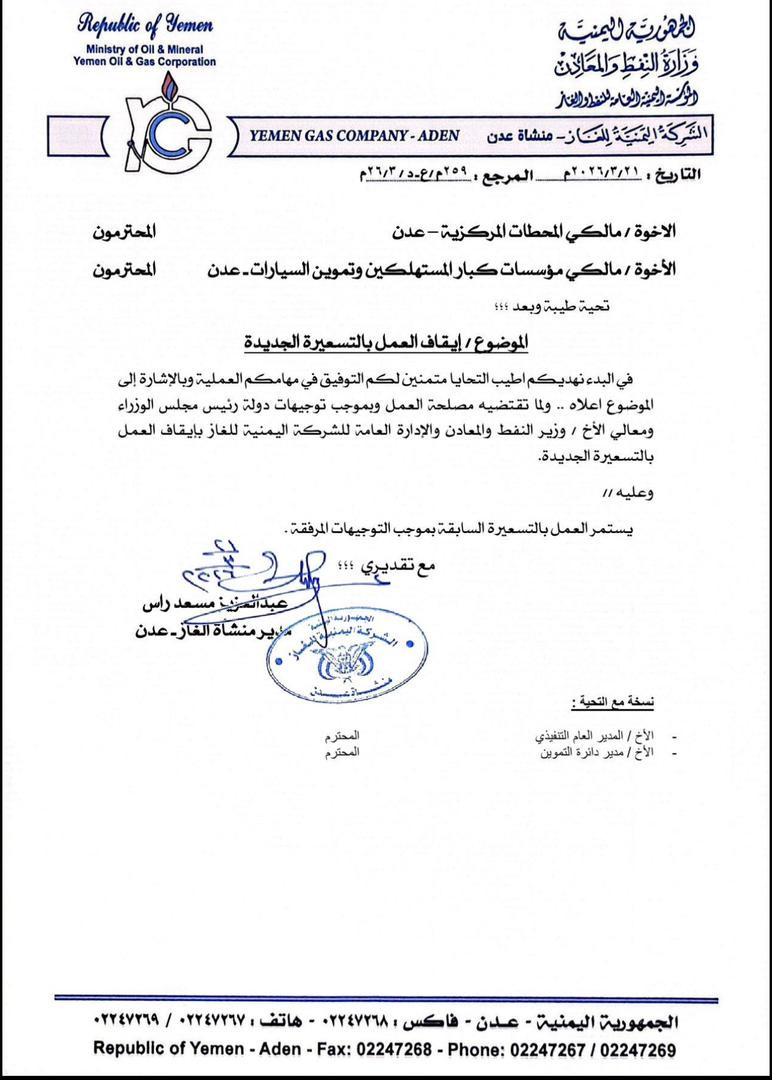 تعميم من منشأة الغاز بعدن لإيقاف التسعيرة الجديدة يعكس حرص القيادة على حماية المواطنين