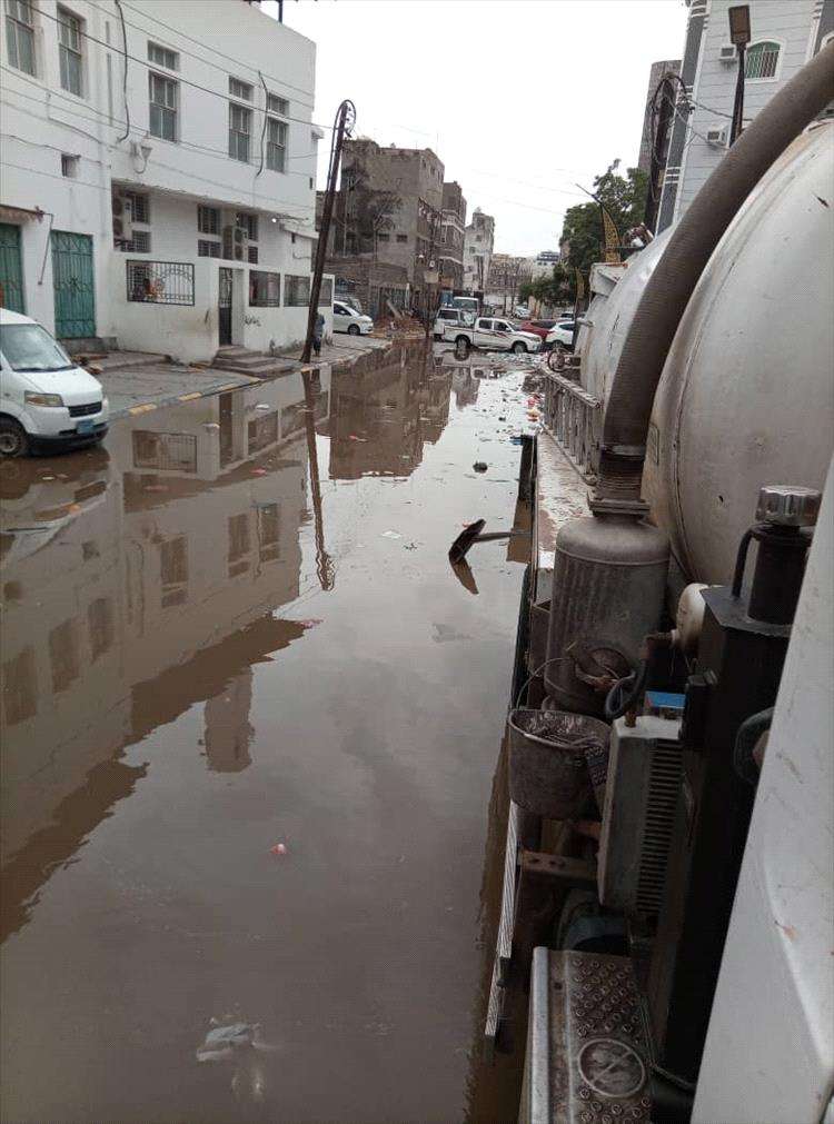 مؤسسة مياه عدن تواصل شفط مياه الأمطار وفتح انسدادات شبكات الصرف الصحي في مديريات العاصمة