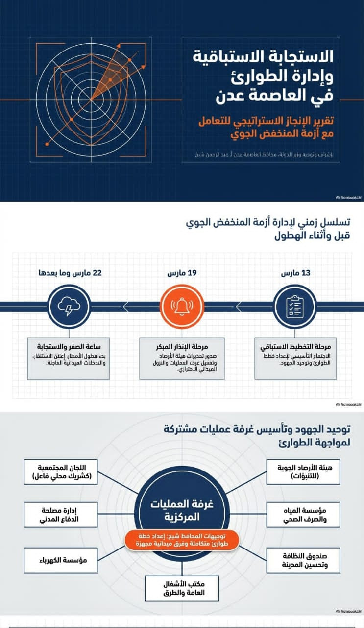 تصدت قيادة السلطة المحلية بالعاصمة عدن، بقيادة وزير الدولة محافظ العاصمة عبد الرحمن شيخ، لتداعيات المنخفض الجوي الذي شهدته العاصمة خلال الفترة الأخيرة، من خلال خطة متكاملة شملت المراحل التحضيرية، ومرحلة الاستجابة المبكرة، والتعامل المباشر مع هطول الأمطار، وصولاً إلى رفع آثارها والتخفيف من المخاطر على المواطنين.