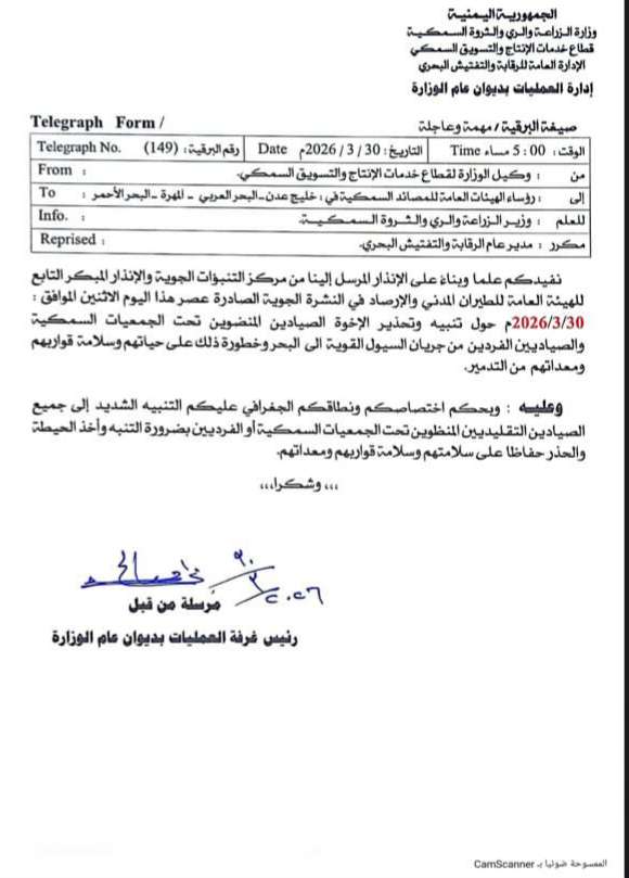 وألزمت وزارة الزراعة والأسماك الجهات المختصة في المصائد السمكية في (خليج عدن -والبحر الأحمر -والبحر العربي -والمهرة ) بضرورة تحذير وتنبيه الصيادين المنضوين تحت الجمعيات السمكية والصيادين المنفردين من جريان السيول القوية إلى البحر وخطورة ذلك على حياتهم وسلامة قواربهم ومعداتهم.