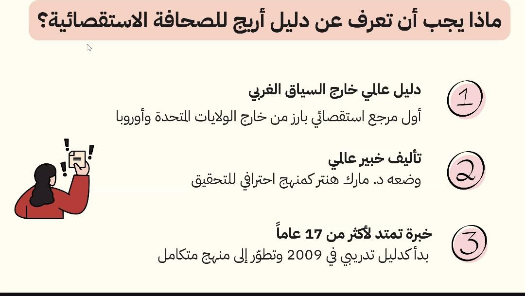 ويأتي تنظيم هذا الويبينار في إطار جهود شبكة إعلاميون من أجل صحافة استقصائية (أريج) الرامية إلى تطوير البيئة الإعلامية العربية، من خلال توفير أدوات معرفية وتدريبية حديثة، ودعم دمج الأدلة المرجعية في المناهج الأكاديمية، بما يسهم في إعداد كوادر صحفية قادرة على إنتاج محتوى مهني قائم على الاستقصاء والدقة والموثوقية.