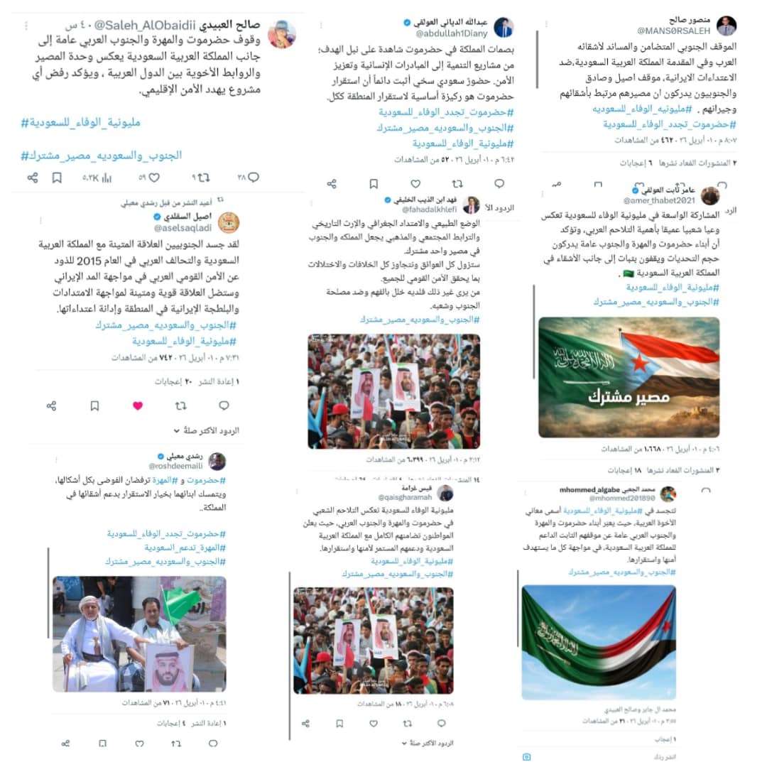 كما أوضح الصحفي محمد الجعبي أن "مليونية الوفاء للسعودية" تمثل تعبيراً صادقاً عن عمق الأخوة العربية، وتعكس موقفاً جنوبياً ثابتاً في مساندة المملكة في مواجهة مختلف التحديات.