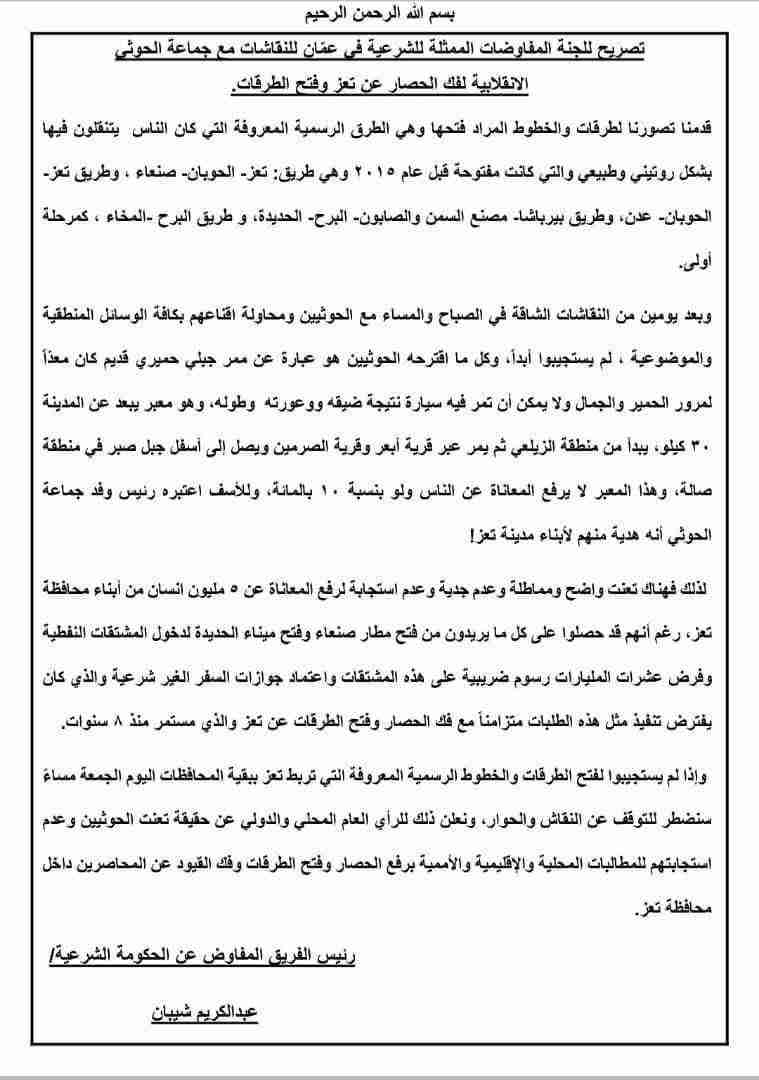 تصريح للجنة المفاوضات الممثلة للشرعية في عمّان للنقاشات مع جماعة الحوثي الانقلابية لفك الحصار عن تعز وفتح الطرقات.