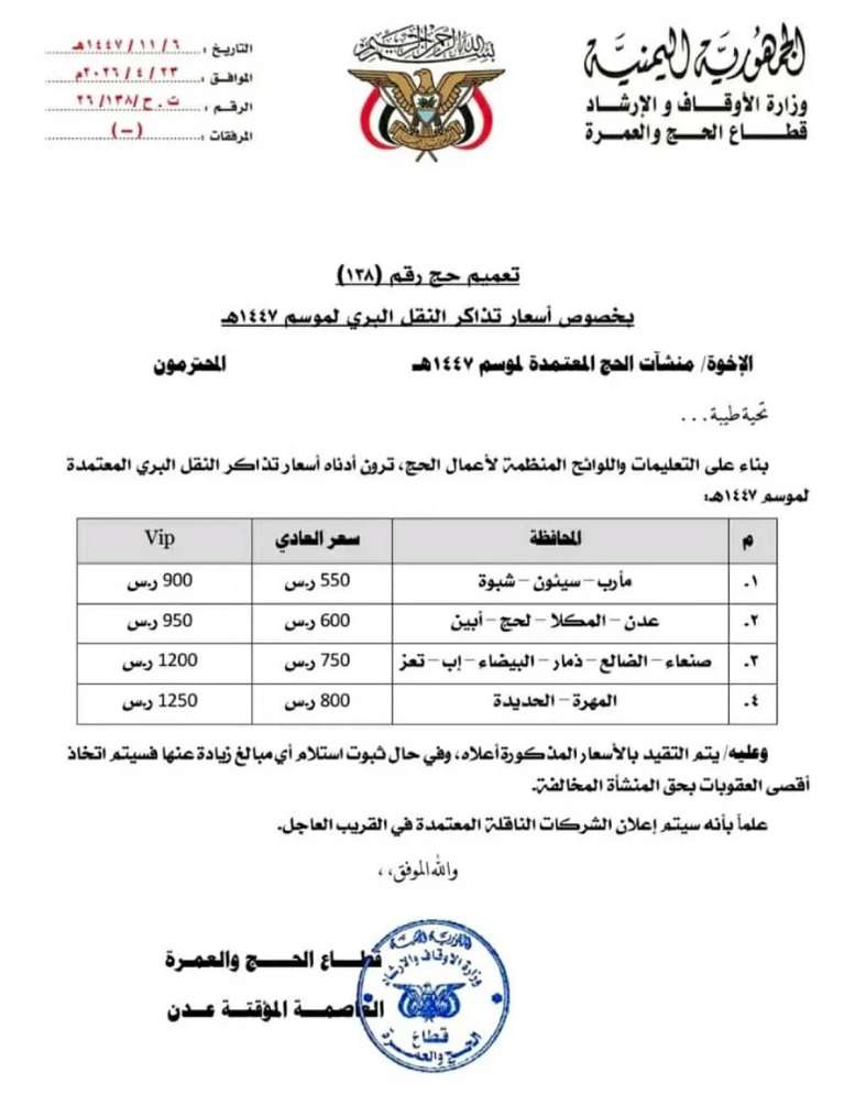 أصدرت وزارة الأوقاف والإرشاد اليمنية (قطاع الحج والعمرة)، اليوم الخميس، التعميم رقم (138) لسنة 1447هـ، والمتضمن القائمة الرسمية لأسعار تذاكر النقل البري المعتمدة لحجاج بيت الله الحرام بمختلف المحافظات.