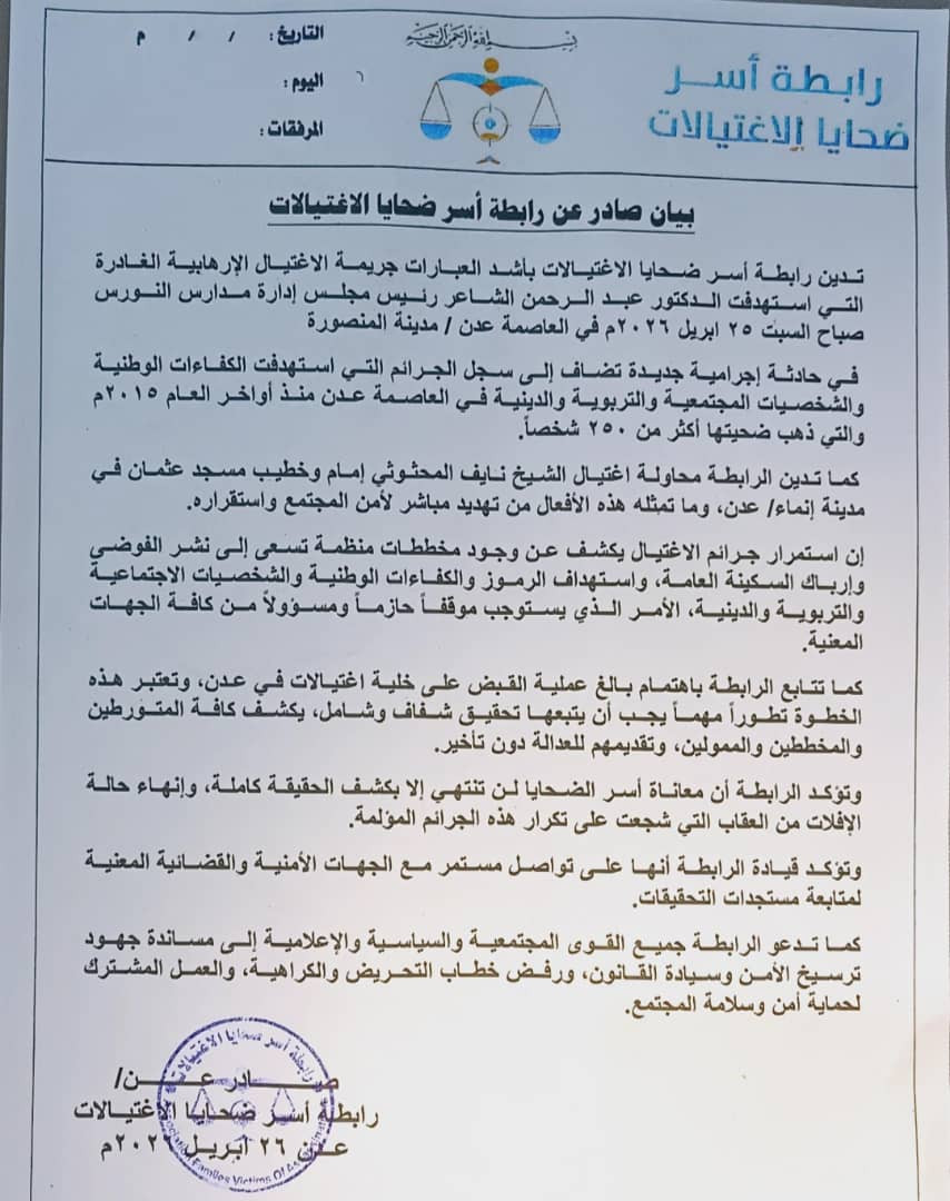 تدين رابطة أسر ضحايا الاغتيالات بأشد العبارات جريمة الإغتيال الإرهابية الغادرة التي استهدفت الدكتور عبد الرحمن الشاعر رئيس مجلس إدارة مدارس النورس صباح السبت ٢٥ ابريل ٢٠٢٦م في العاصمة عدن / مدينة المنصورة في حادثة إجرامية جديدة تضاف إلى سجل الجرائم التي استهدفت الكفاءات الوطنية والشخصيات المجتمعية والتربوية والدينية في العاصمة عدن منذ أواخر العام ٢٠١٥م والتي ذهب ضحيتها أكثر من ٢٥٠ شخصاً.