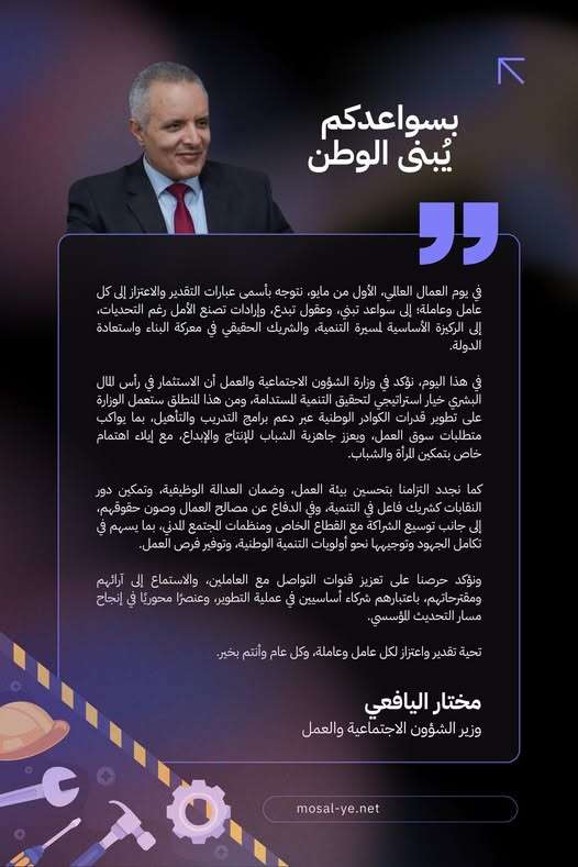 واختتم وزير الشؤون الاجتماعية والعمل مختار اليافعي، بتوجيه تحية تقدير واعتزاز لكل عامل وعاملة، متمنياً لهم دوام التوفيق.