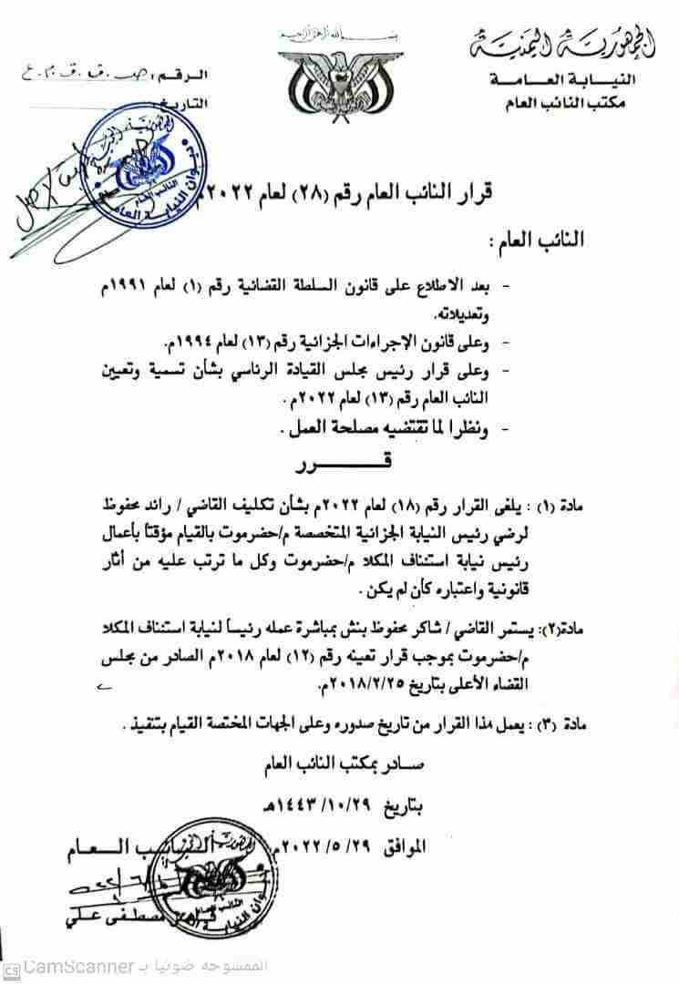 القرار قضى بإلغاء قرار تكليف قائم بأعمال رئيس نيابة استئناف المكلا، الذي سبق وأصدره النائب العام السابق أحمد الموساي.