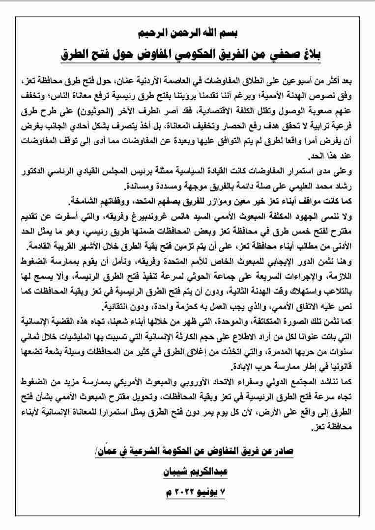 عاجل.. بلاغ صحفي صادر عن الفريق الحكومي المفاوض حول فتح طرق تعز