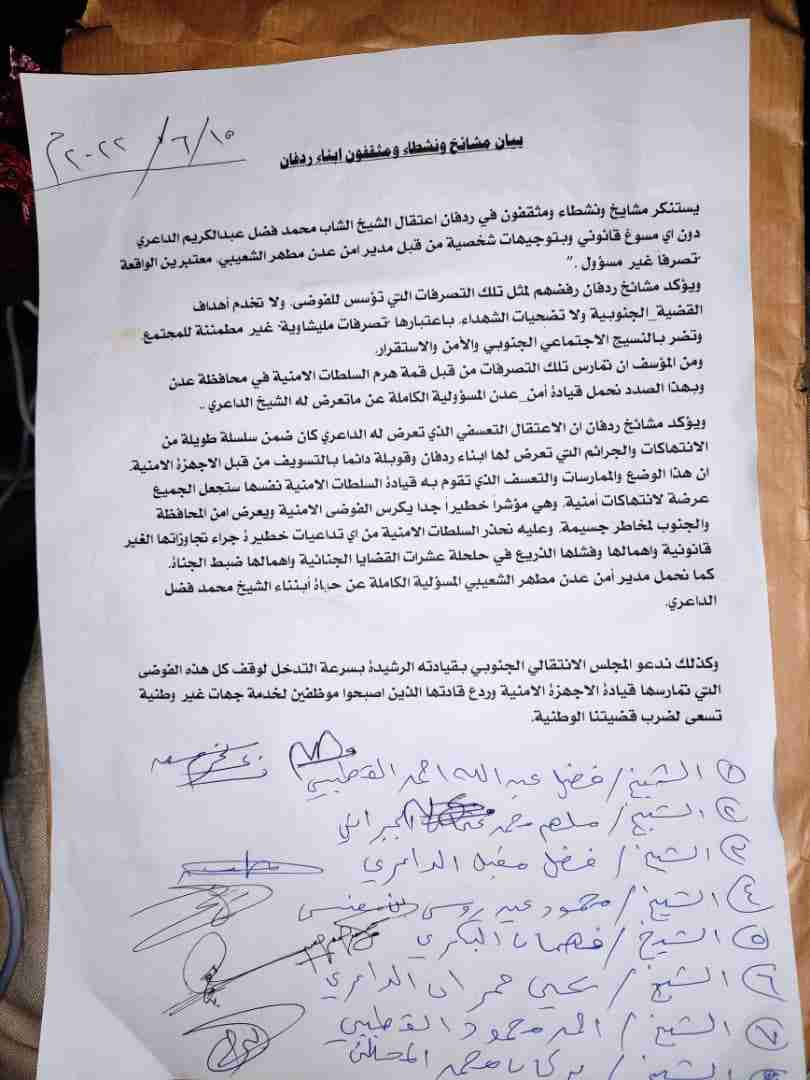 مشايخ ووجهاء ردفان يستنكرون عملية اعتقال الشاب محمد فضل الداعري من قبل أمن عدن