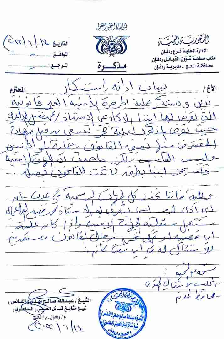 أصدر مشائخ ووجها ومثقفوا رباعية ردفان بمحافظة لحج بيان إدانة واستنكار جرأ إقدام السلطات الأمنية في العاصمة عدن باعتقال الشيخ محمد فضل الداعري بداية الأسبوع الحالي .