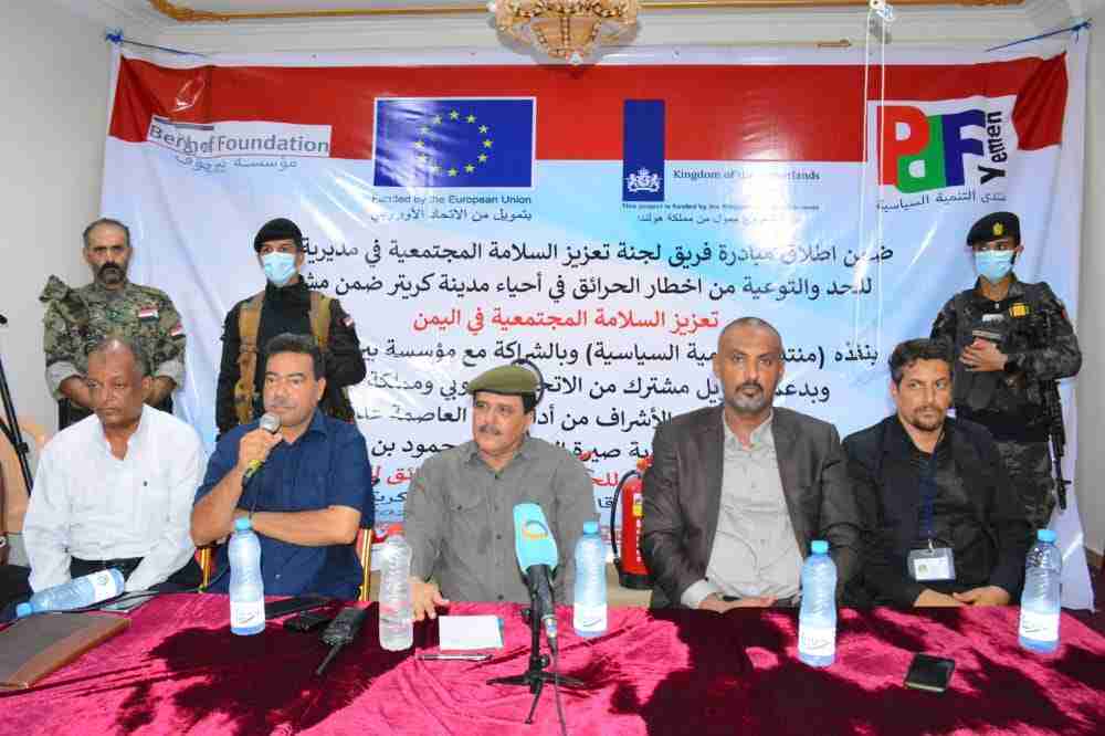 عقدت لجنة السلامة المجتمعية بمديرية صيرة، اليوم، الجلسة التوعوية الثانية حول "الحد من أخطار الحرائق، وذلك ضمن مشروع تعزيز السلامة المجتمعية الذي ينفذه منتدى التنمية السياسية في العاصمة عدن، بالشراكة مع مؤسسة بيرجهوف الألمانية وبدعم وتمويل مشترك من الاتحاد الاوروبي ومملكة هولندا.