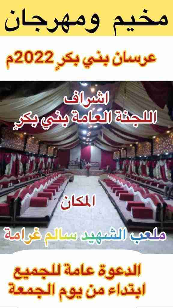وقالت اللجنة أن مهرجان اعراس بني بكرٍ لعام 2022م سيكون في مخيم كرنفالي فني وفلكلور لعرسان بني بكرٍ في ملعب الشهيد سالم غرامة للتخزين والمغيل.