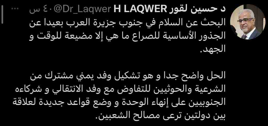 وأشار الدكتور لقور بأن"الحل واضح جدا و هو تشكيل وفد يمني مشترك من الشرعية والحوثيين للتفاوض مع وفد الانتقالي و شركاءه الجنوبيين على إنهاء الوحدة و وضع قواعد جديدة لعلاقة بين دولتين ترعى مصالح الشعبين".