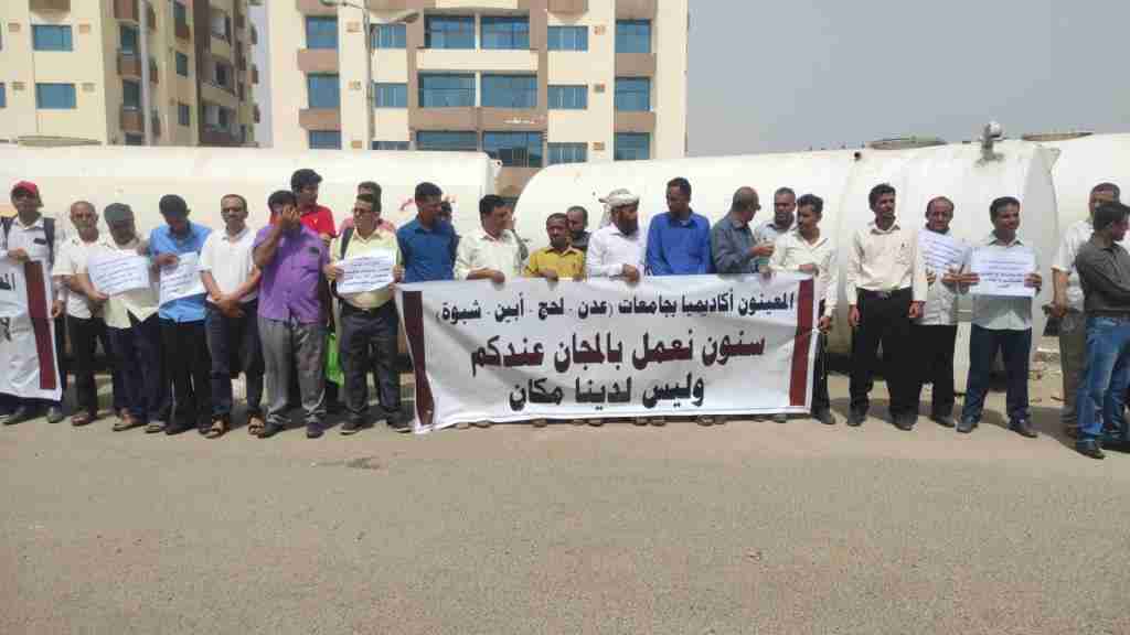 ونفذ الأكاديميون وقفةً أحتجاجية في ساحة العروض بمديرية خورمكسر، والتي مثلت تجمعًا للعشرات منهم، قبل أن ينتقلوا للاحتجاج أمام مبنى ديوان عام وزارة الخدمة المدنية بعدن، ومطالبة قيادتها بتسوية أوضاعهم ماليا وإداريًا.