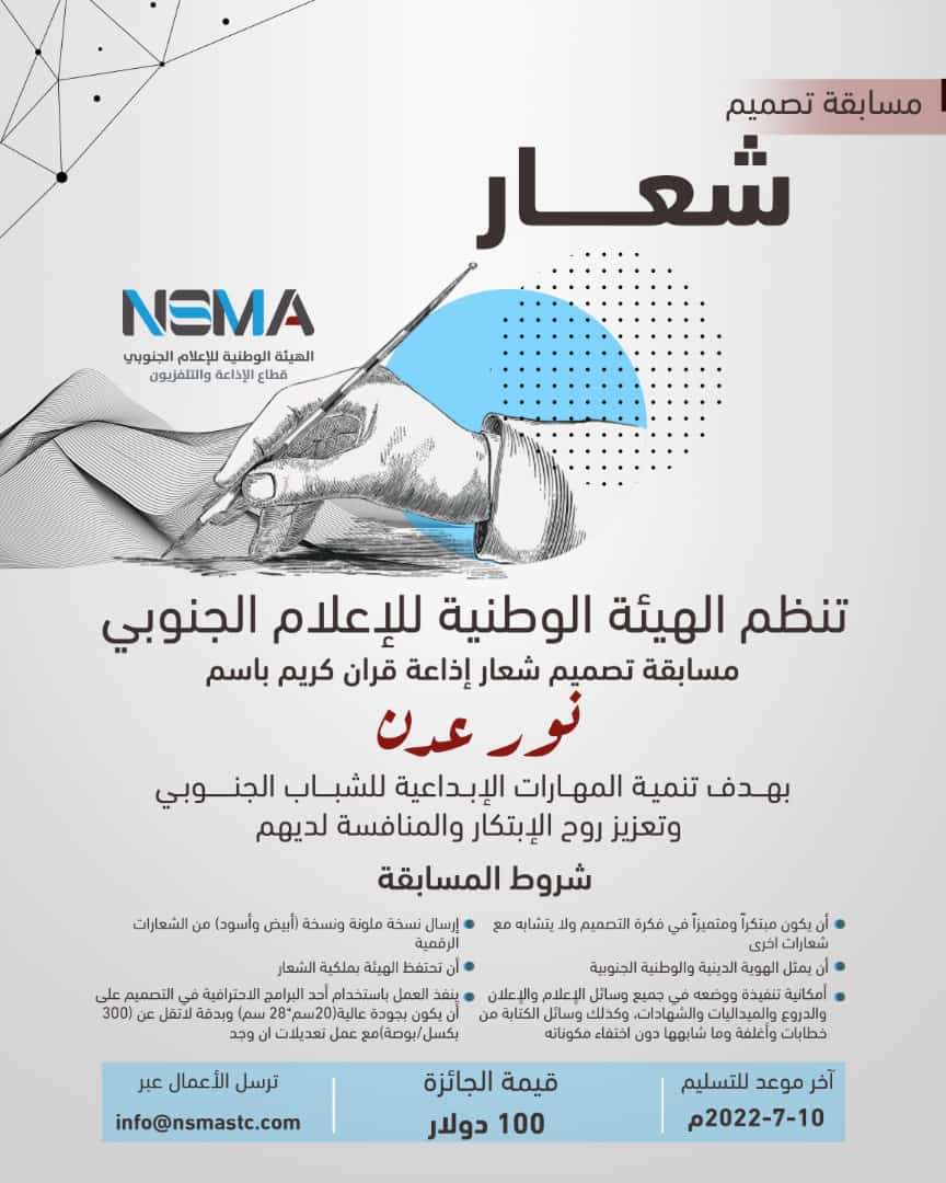 أعلنت الهيئة الوطنية للإعلام الجنوبي عن تنظيم مسابقة لتصميم شعار إذاعة قرآن كريم باسم "نور عدن". بهدف تنمية المهارات الإبداعية للشباب الجنوبي، وتعزيز روح الابتكار والمنافسة لديهم.