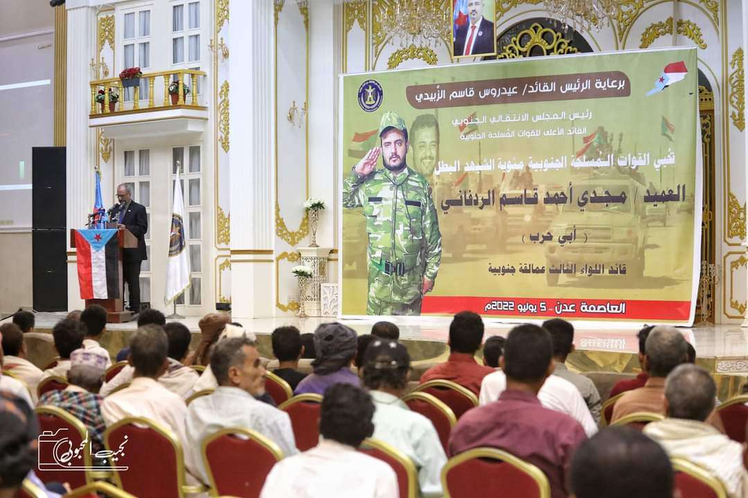 وفي الفعالية التي استهلت بآيات من الذكر الحكيم، أعقبها النشيد الوطني الجنوبي، والوقوف دقيقة حداد لقراءة الفاتحة على أرواح الشهداء، بحضور كل من أعضاء هيئة رئاسة المجلس الانتقالي الجنوبي، الأستاذ لطفي شطارة، نائب رئيس الجمعية الوطنية للمجلس الانتقالي، والعميد طيار ناصر السعدي، والدكتور محمد الزعوري، وزير الشؤون الاجتماعية والعمل، والعميد محسن الوالي القائد العام للأحزمة الأمنية، والعميد مختار النوبي، قائد محوري أبين وكرش قائد اللواء الخامس دعم وإسناد، وذوي الشهيد وعدد من رؤساء الهيئات التنفيذية للمجلس في المحافظات الجنوبية وقيادات أمنية وعسكرية وشخصيات اجتماعيه، ألقى الأستاذ فضل محمد الجعدي، عضو هيئة رئاسة المجلس الانتقالي الجنوبي، نائب الأمين العام للأمانة العامة لهيئة رئاسة المجلس، كلمة نقل في مستهلها تحايا الرئيس القائد عيدروس الزُبيدي، رئيس المجلس الانتقالي القائد الأعلى للقوات المسلحة الجنوبية.