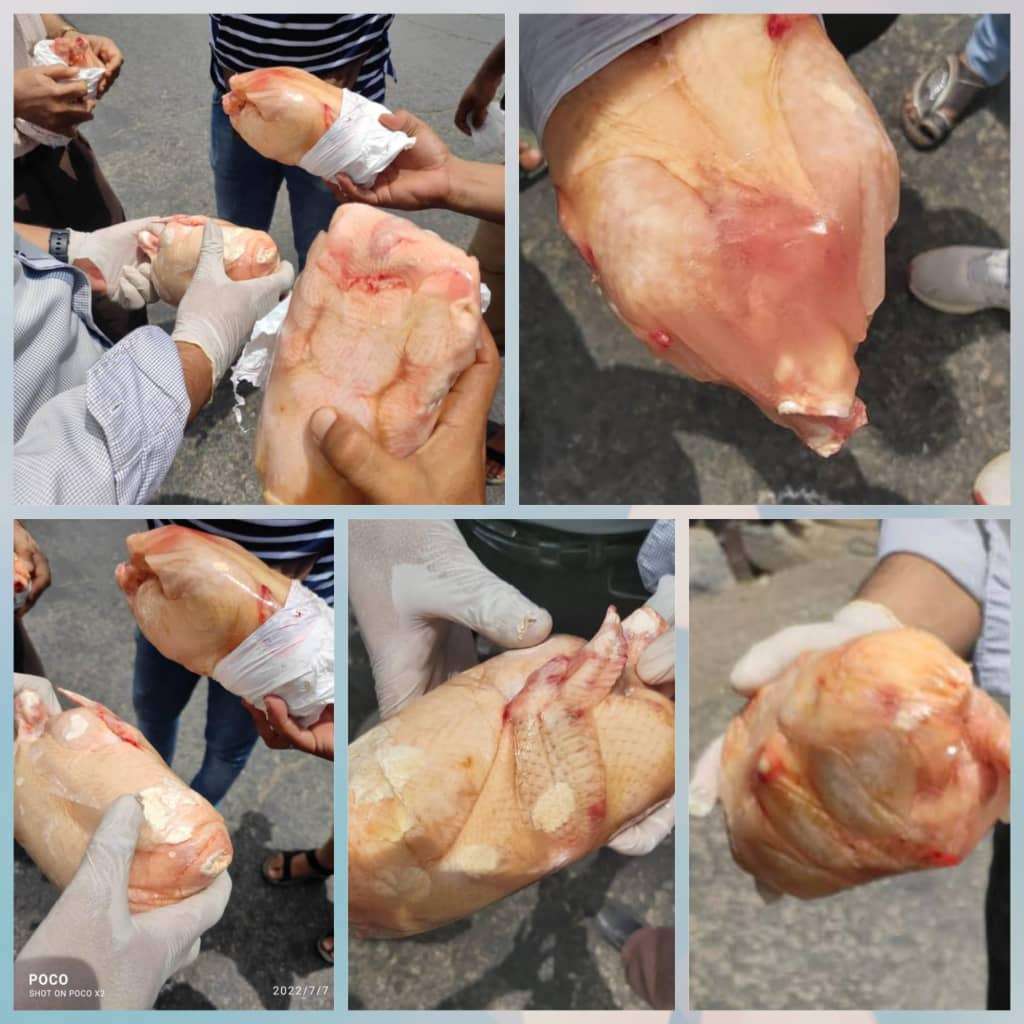 قامت الهيئة اليمنية للمواصفات والمقاييس وضبط الجودة اليوم الخميس الموافق 7 /يوليو/2022م عبر مكتبها بميناء المنطقة الحرة بالعاصمة عدن، بضبط حاوية بطول 40 قدم تحمل (2415 )كرتون (الفان واربعمائة وخمسة عشر ) كرتون دجاج مستورد فاسد ماركة الريشة البيضاء ذات المنشأ البرازيلي وزن (1100 جرام).