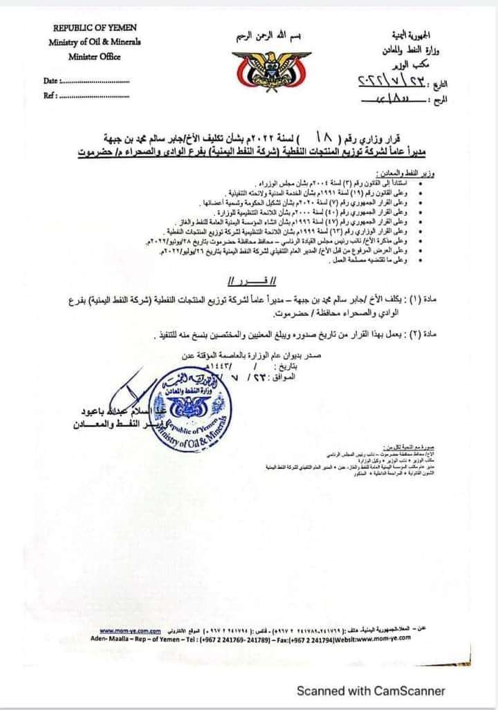 وقضى قرار وزير النفط، تكليف الأخ جابر سالم محمد بن جبهة مديرًا عامًا لشركة توزيع المنتجات النفطية (شركة النفط اليمنية) فرع وادي وصحراء حضرموت، على أن يعمل بهذا القرار من تاريخ صدوره ويبلغ المعنيين والمختصين بنسخ منه للتنفيذ.
