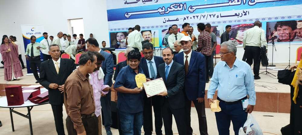 كرم وزير الإعلام والثقافة والسياحة الأخ معمر الارياني صباح اليوم في العاصمة عدن كوكبة من الفنانين اليمنيين في الحفل الفني والتكريمي بمناسبة مهرجان الاغنية اليمنية الذي نظمته وزارة الاعلام والثقافة والسياحة وبدعم من كام بنك وبحضور الاخ محمد نصر شاذلي وكيل اول محافظة عدن وبمشاركة كوكبة من الفنانين والشعراء. والشخصيات الاجتماعية.