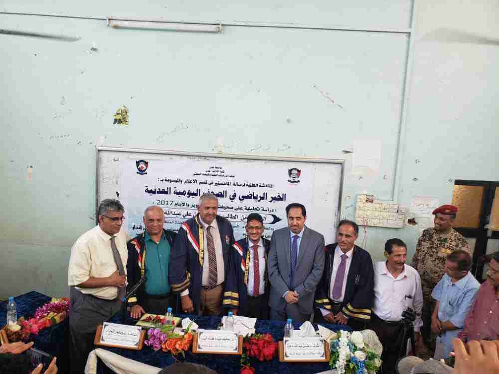 وأشادت لجنة المناقشة بالرسالة العلمية المقدمة من قبل الباحث كأول رسالة حقيقية تناقش موضوع الاعلام الرياضي في عدن مبنية على أسلوب تحليل المضمون .
