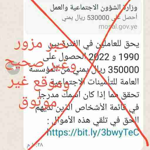 نفت المؤسسة العامة للتأمينات الاجتماعية بالعاصمة المؤقتة عدن، مايتم تناوله عبر وسيلة التواصل الاجتماعي واتساب، مؤكدة بأنه لا صحة لصرف مبلغ مالي من قبل المؤسسة للعاملين دون أن يكون هناك استحقاق قانوني.