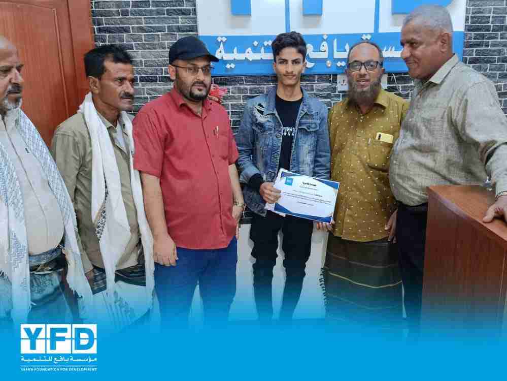 مَنَحَتْ مؤسسةُ يافع للتنمية -YFD شهادةً تقديريةً، وقدّمت الدعم للطالب/ محمد طالب محمد طالب السعدي، من ثانوية النهضة، في مديرية الشيخ عثمان/عدن؛ لتفوُّقِه وفوزِه في بحثه العلمي عن صهاريج وسدود وآبار عدن، واختيارِه مُمثِّلًا لمحافظة عدن واليمن للمشاركة في أولمبياد الألكسو لتنمية مهارات الطفل العربي للبحث العلمي، المُقام في جمهورية تونس.