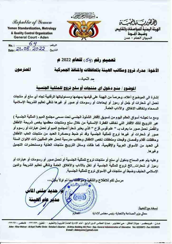 أصدرت الهيئة اليمنية للمواصفات والمقاييس وضبط الجودة اليوم الاحد الموافق 21/أغسطس/2022م، تعميماً رسمياً لكافة فروع ومكاتب الهيئة بالمحافظات والمنافذ الجمركية بعدم السماح بدخول اي سلع او منتجات تروج للمثلية الجنسية او تحمل علم ما يعرف “بعلم قوس قزح” الذي يعتبر شعار المثليين او تحمل رسومات او عبارات او رموز او ايحاءات او صور تخل بالاخلاق والآداب العامة وتنافي تعاليم الشريعة الاسلامية الغراء.