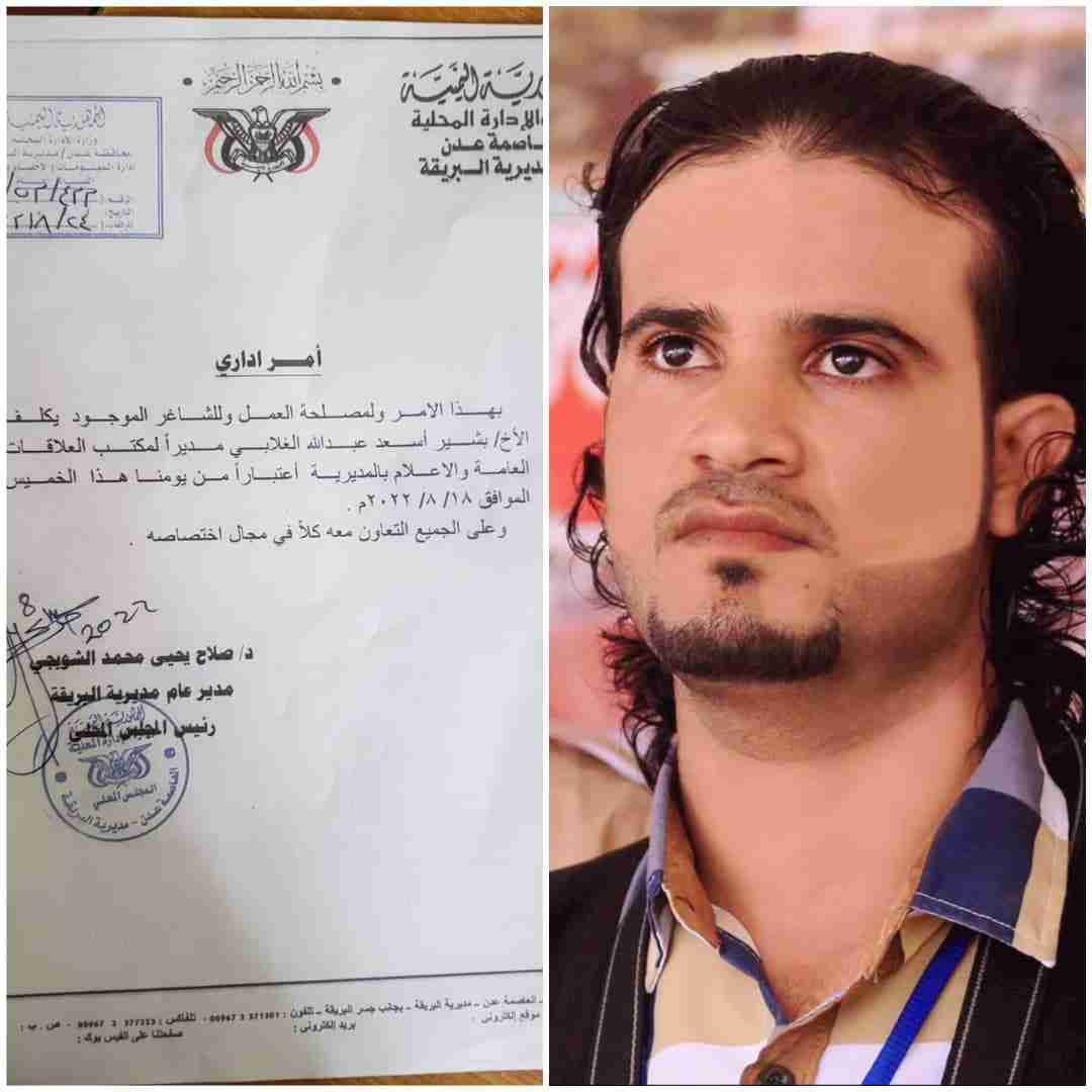 أصدر الدكتور/ صلاح يحيى محمد الشوبجي مدير عام مديرية البريقة رئيس المجلس المحلي، أمرًا إداريًا، قضى بتكليف الأخ/ بشير أسعد عبدالله الغلابي مديرًا لمكتب العلاقات العامة والإعلام بالمديرية.
