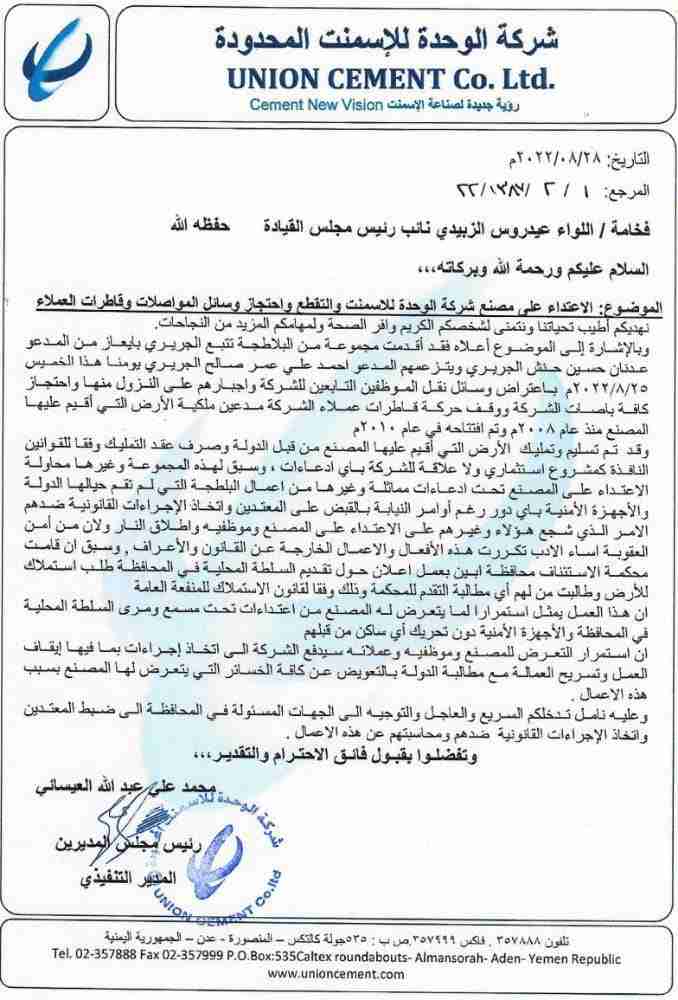 بعثت شركة الوحدة للأسمنت المحدودة ، مذكرة رسمية إلى نائب رئيس مجلس القيادة الرئاسي اللواء عيدروس الزبيدي ، أوضحت ما يتعرض له مصنع الشركة من إعتداءات وتقطعات مستمرة تنفذها مجموعة مسلحة في محافظة أبين.