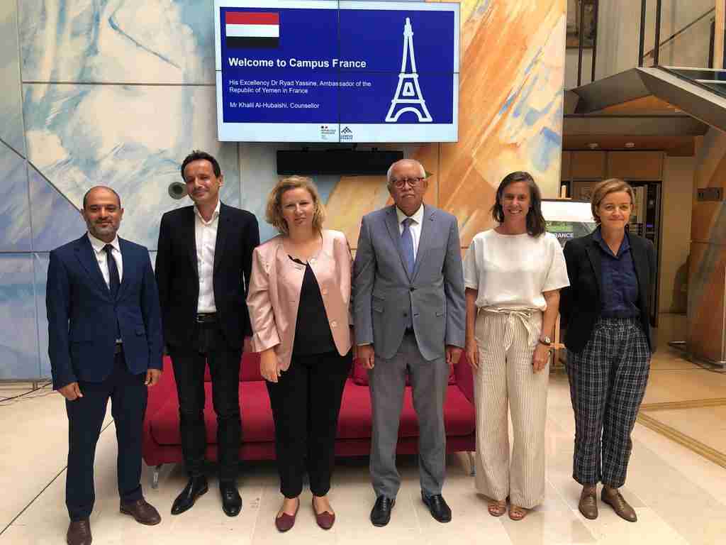 بحث سفير بلادنا لدى فرنسا الدكتور رياض ياسين، اليوم، مع المديرة العامة لمؤسسة كوموبس فرانس CampusFrance دوناتيين هيسارد، ونائبة المديرة العامة لقطاع التنسيق الجغرافي جولييت ليناريس، ومسؤول قسم شمال افريقيا والشرق الأوسط سيرجي بورياس، أوجه التعاون المشترك لايجاد الممولين للمنح الدراسية للطلاب اليمنيين لمواصلة تعليمهم العالي في الجامعات الفرنسية.
