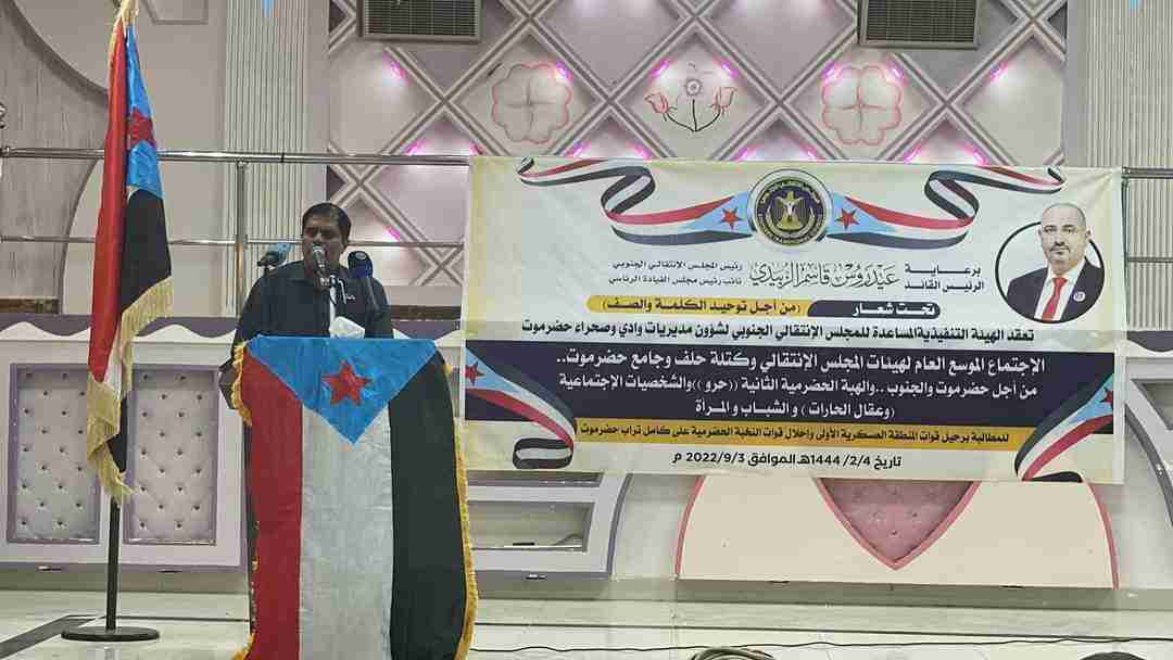 *والمجلس الانتقالي اليوم يده ممدودة للجميع ويرحب بكل أبناء الجنوب ويدعوهم للمشاركة في صناعة المستقبل، وإخراج بلدنا وشعبنا من الحروب والأزمات، ونؤكد وقوفنا إلى جانب السلطة المحلية بالمحافظة بقيادة المحافظ الأستاذ مبخوت مبارك بن ماض، لما فيه مصلحة حضرموت والجنوب.*