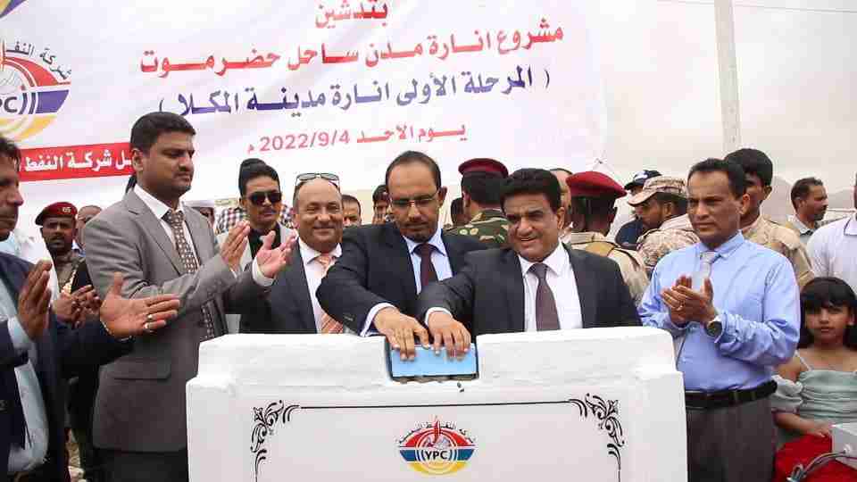 ووضع الوزير والمحافظ حجر الأساس لمشروع إنارة شوارع المدن الرئيسة بساحل حضرموت بالطاقة الشمسية، بتمويل من شركة النفط بساحل حضرموت، تدشيناً لبدء العمل بالمشروع الذي يأتي ضمن تدخلات الشركة المجتمعية، وللتخفيف من أعباء توليد الكهرباء عبر توفير أعمدة إنارة بالطاقة الشمسية للمدن الرئيسة.