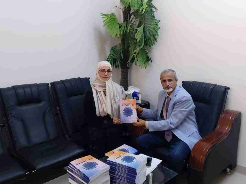 وتبادلا اطراف الحديث حول انشطة منظمات المجتمع المدني ومشاركته في النهوض بالوضع الصحي وقدمت الدكتورة ميادة مجموعة نسخ من كتاب Aguide in critical care management of COVID 19 للدكتور الشبحي.