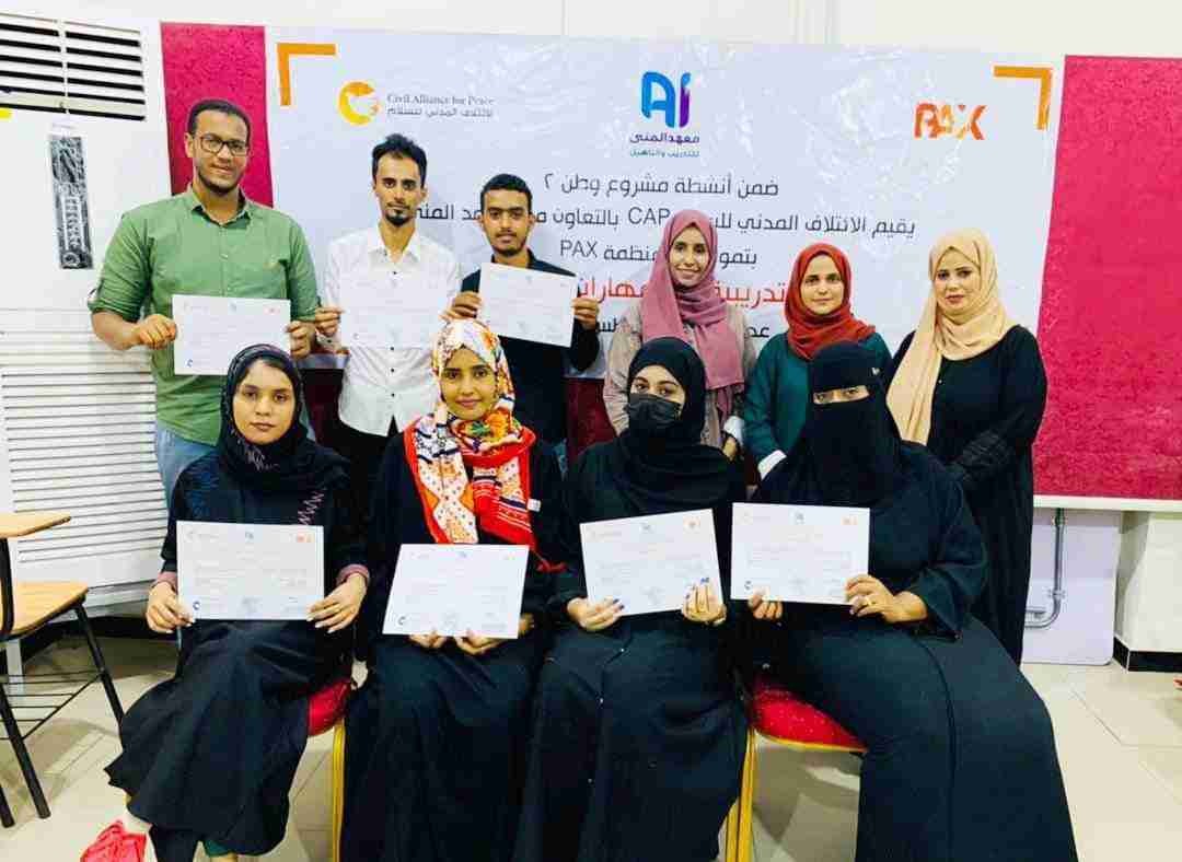 أختتمت يوم أمس دورة تدريبية في العاصمة المؤقته عدن حول مهارة المناصرة أستهدفت الشباب ضمن مشروع "وطن" أقامها الإئتلاف المدني للسلام (CAP)_ بالتعاون مع "معهد المنى للتدريب والتأهيل" بتمويل من منظمة (PAX).