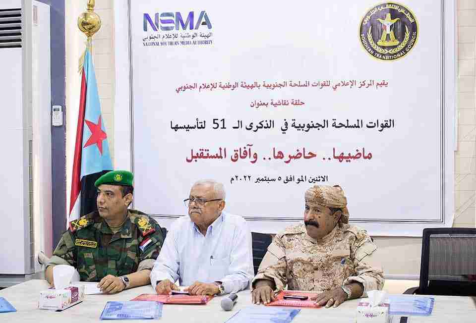 نظم المركز الإعلامي للقوات المسلحة الجنوبية بالهيئة الوطنية للإعلام الجنوبي اليوم الاثنين، في قاعة قطاع التدريب والتأهيل للهيئة بالعاصمة عدن، حلقة نقاش بعنوان "القوات المسلحة الجنوبية في الذكرى الـ 51 لتأسيسها - ماضيها.. حاضرها، وآفاق المستقبل".