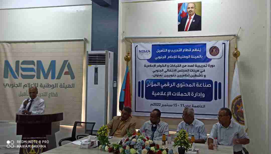 دشن قطاع التدريب والتأهيل بالهيئة الوطنية للإعلام الجنوبي الدورة التدريبية " صناعة المحتوى الرقمي المؤثر وإدارة الحملات الإعلامية " صباح يوم الأحد 11 سبتمبر 2022م، لعدد من القيادات والكوادر الإعلامية في هيئات المجلس الانتقالي الجنوبي وناشطين جنوبيين ، بالعاصمة عدن.