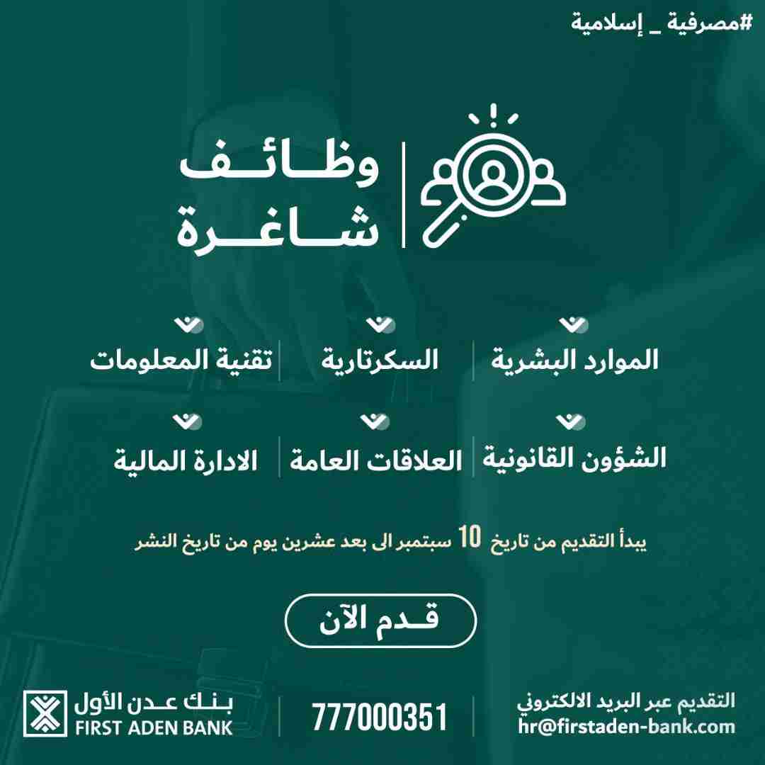 إدارة بنك عدن الأول تعلن عن وظائف شاغرة