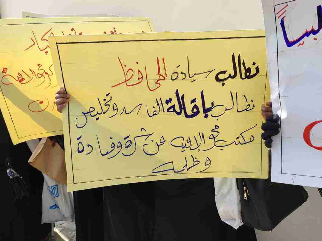 ورفع المحتجات لافتات كتب عليها: "نحن متعاقدات محو الأمية نطالب المحافظ أحمد لملس إنصافنا من الفساد الموجود في الإدارة العامة لمحو الأمية وتعليم الكبار؛ كما ورفعت لافتة أخرى كتبا عليها:" العقود الوهمية من قبل الإدارة أثرها سلبي على المتعاقدات، يا محافظ عدن نحن متعاقدات محو الأمية نعاني من الظلم فمن يا ترى من ينصفنا؟ "