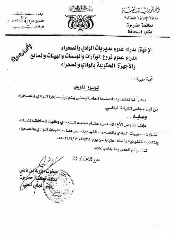 ووفق قرار محافظ حضرموت المعمم إلى فروع الوزارات والمؤسسات والهيئات والاجهزة الحكومية في وادي وصحراء حضرموت، فقد تم تفويض الوكيل المساعد هشام محمد السعيدي قائما بأعمال مؤقت، حتى يتم تعيين بديلاً له من قبل المجلس الرئاسي .