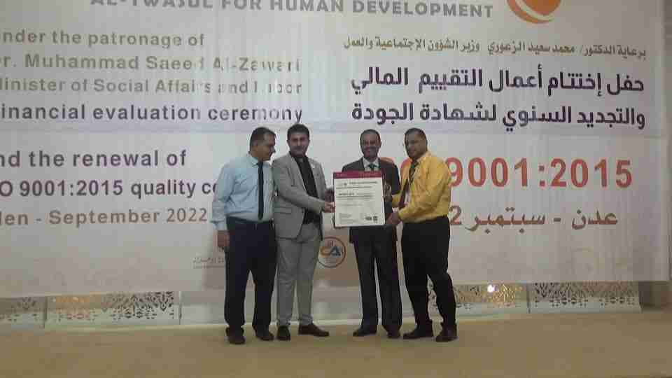 نظمت مؤسسة التواصل لتنمية الانسانية، اليوم، حفلاً سنوياً لاختتام اعمال التقييم المادي وحصولها على التجديد السنوي لشهادة الجودة 2015: 90001 ISO للمؤسسة.