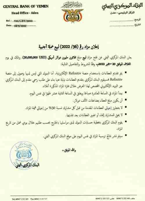 يعلن البنك المركزي اليمني عن فتح مزاد لبيع مبلغ ثلاثون مليون دولار أمريكي (30,000,000 USD)، وذلك في يوم الثلاثاء الموافق 20 سبتمبر 2022م، وفقًا للشروط والتفاصيل التالية: