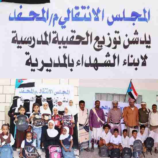 بدأت القيادة المحلية للمجلس الانتقالي الجنوبي في مديرية المحفد بمحافظة أبين، اليوم الأحد، توزيع الحقائب المدرسية على أبناء الشهداء.