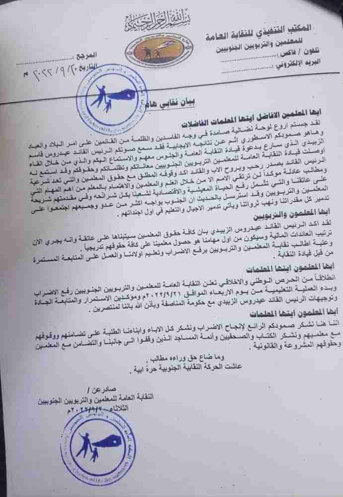 ويأتي هذا البيان النقابي عقب ساعات من لقاء جمع قيادة النقابة بالرئيس الزُبيدي في عدن، واستجابت فيه لدعوة الرئيس لرفع الإضراب، الذي بدوره وعد بوضع حقوق المعلمين ضمن الأولويات.