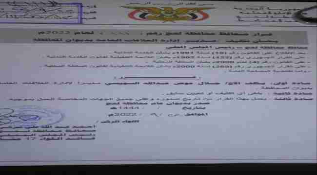 أصدر محافظ محافظة لحج قائد اللواء 17 مشاة اللواء الركن احمدعبدالله تركي قرار رقم 111 للعام 2022م قضت المادة الأولى من القرار بتكليف الأستاذ/ جلال عوض عبد الله السويسي مدير إدارة العلاقات العامة بديوان المحافظة.