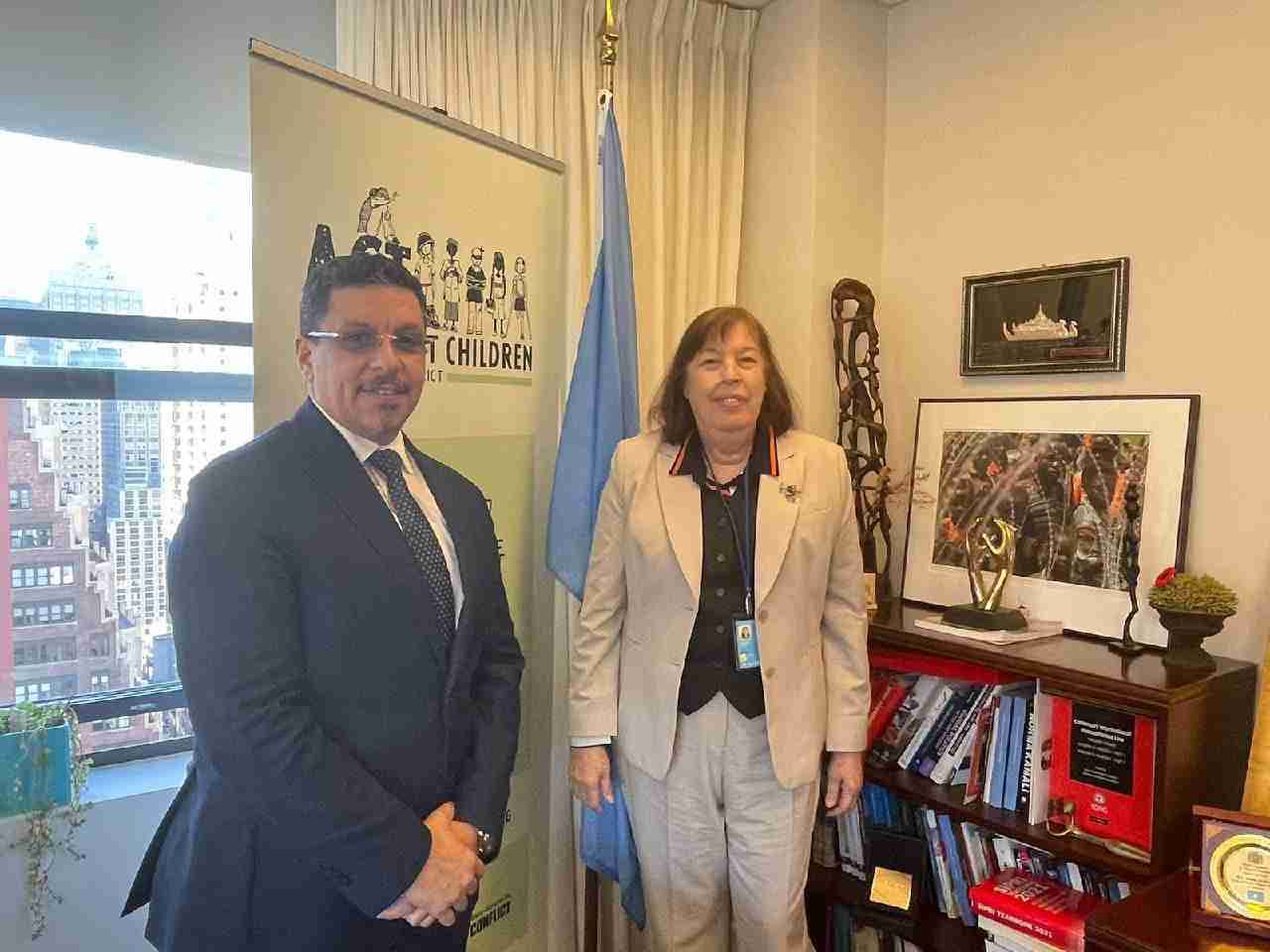 بحث وزير الخارجية وشؤون المغتربين الدكتور احمد عوض بن مبارك، اليوم في نيويورك، مع وكيلة الأمين العام للأمم المتحدة للأطفال والنزاع المسلح فرجينيا جامبا، تعزيز التعاون بين بلادنا والامم المتحدة لحماية الأطفال.